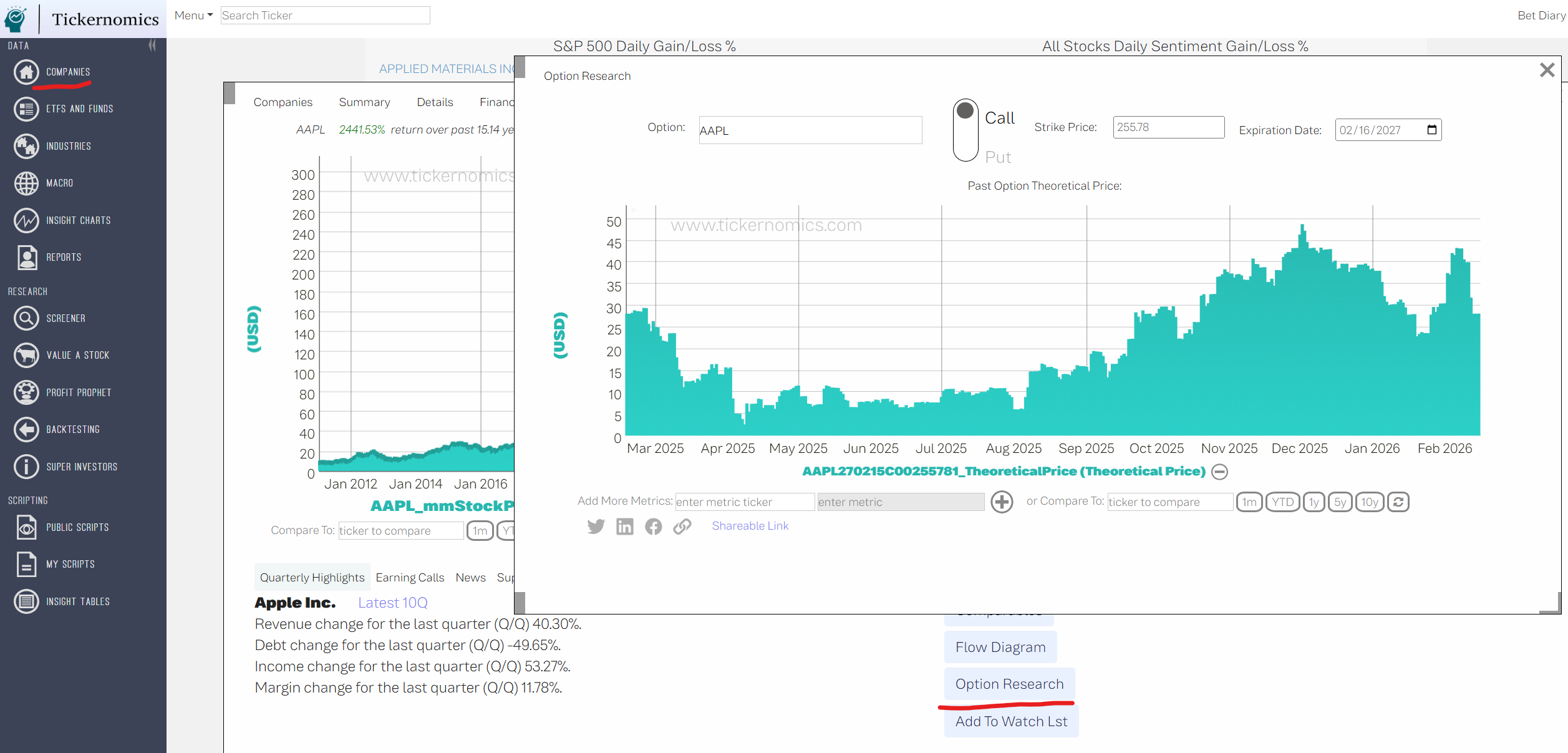 These commands are designed to retrieve some theoretical properties such as the theoretical price of an option. Everyone heard about Black Scholes equation to price options but since Tickernomics primarily deals with stocks and not indices the Black Scholes equation is not fit to price options for stocks since those options are so called American Options, while options that deal with indices and for which Black Scholes equation is designed are called European options. To properly price American options a Monte Carlo method is utilized. Here is how to get a theoretical price of AAPL call option with expiration date 01/23/2027 and a strike price 273.0: